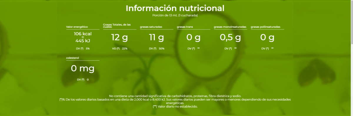 Un producto 100% natural sin conservantes añadidos. Con él, reemplazas el aceite convencional y le agregas sabor y salud a tu mesa.